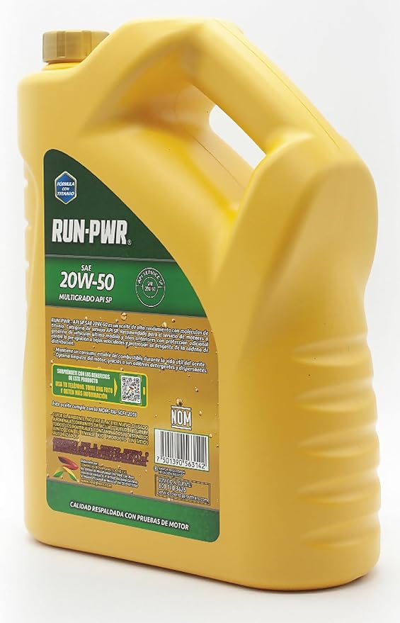 DESCRIPCIÓN… El aceite RUN-PWR API SP ILSAC GF-6A está formulado con aceites básicos hidrofraccionados y un paquete de aditivos adicionado con moléculas de Titanio, combinación que lo hace superar las más exigentes pruebas de motor establecidas en la Categoría de Servicio API SP e ILSAC GF-6A que requieren los motores actuales.