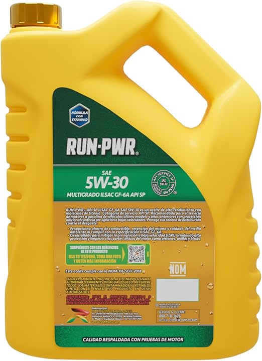 DESCRIPCIÓN… El aceite RUN-PWR API SP ILSAC GF-6A está formulado con aceites básicos hidrofraccionados y un paquete de aditivos adicionado con moléculas de Titanio, combinación que lo hace superar las más exigentes pruebas de motor establecidas en la Categoría de Servicio API SP e ILSAC GF-6A que requieren los motores actuales.
